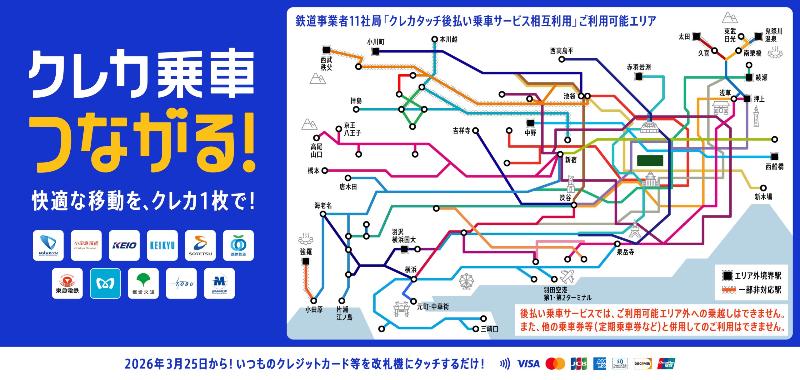 関東エリアの鉄道事業者11社局は、クレジットカード等のタッチ決済による相互利用を、2026年3月25日(水)始発から開始します。 タッチ決済のポイント タッチ決済が、事業者の垣根を越えて利用可能 IC ...
