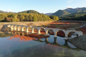 October–November: The water recedes again, revealing the bridge amid autumn colors.