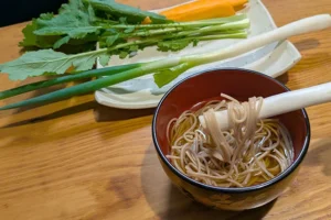 Negi Soba (ねぎそば) – The most iconic dish. Buckwheat noodles are served in a hot broth, eaten using a long green onion instead of chopsticks! This unique experience is both fun and symbolic of the area’s humor and hospitality.