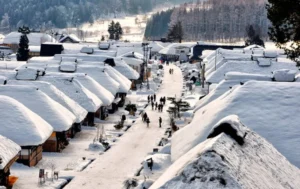 Winter: Deep snow covers the rooftops, and warm lanterns glow in the twilight.
