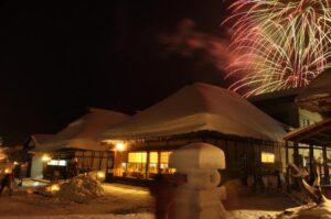 The highlight of the year is the Ōuchi-juku Snow Festival (大内宿雪まつり) in February, when the village is illuminated by hundreds of snow lanterns and candles, creating a magical, almost otherworldly atmosphere. Fireworks light up the sky above the snowy thatched houses — a truly unforgettable sight.