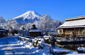 Winter: Snow-covered village and clear Mount Fuji views