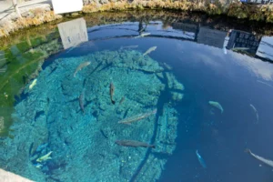 Clear water revealing fish and aquatic plants