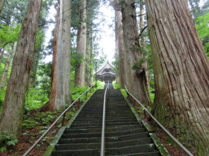 One of the most striking features of Togakushi Shrine is the cedar tree-lined approach to Okusha. The tall, straight trunks create a dramatic corridor that enhances the spiritual atmosphere.