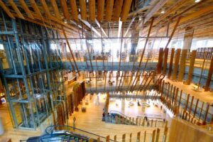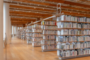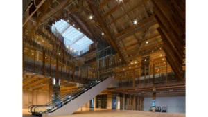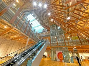The library’s open layout, natural wood interiors, and soft lighting make it a relaxing space to read or simply enjoy the architecture.