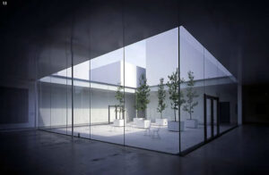 Transparent glass exterior walls that blur the boundary between inside and outside
