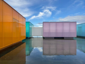 The museum stands on a coastal site with panoramic views of the Seto Inland Sea, Japan’s famed island-dotted waterway. Its architecture emphasizes elegant simplicity, a sense of floating space, and harmony with the surrounding natural landscape. Water, light, and reflection play central roles throughout the museum, making the visitor experience feel both serene and cinematic.
