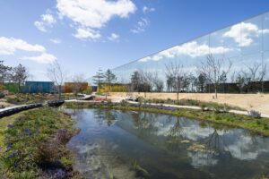 The main gallery building appears to float on a large reflective water basin. This creates a sense of weightlessness and transforms the building into a sculpture that changes with the weather and time of day.