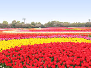 In spring, the park is famous for its vibrant tulip fields arranged in colorful geometric patterns. Depending on timing, cherry blossoms may bloom around the park, adding soft pink tones to the landscape.