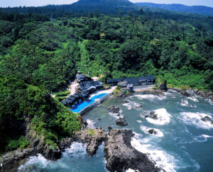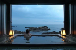 Open-air baths (rotenburo) facing the ocean, where you can soak while listening to the waves crashing below.