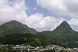 Distinctive twin mountains seen from the highland, known for their helmet- and armor-like shapes.