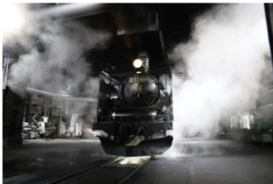 検修庫(メンテナンス施設)に留置し、蒸気の排出や前照灯・庫内照明の切替えなど、夜間の幻想的な撮影シーンを演出します。