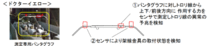 これまでのドクターイエローでは、測定専用パンタグラフにセンサを搭載して架線を点検。