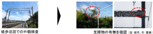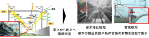 営業車の運転台に設置したカメラで、電線や電柱などの支障物を高速走行中に自動検知。