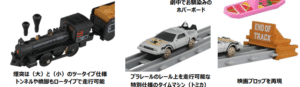 車両のモールドやカラーリングを忠実に再現し、「タイムマシン(トミカ)」「ホバーボード」「“END OF TRACK”とペイントされた特別仕様の車止め」など、映画の世界観を楽しめる要素が盛り込まれています。