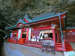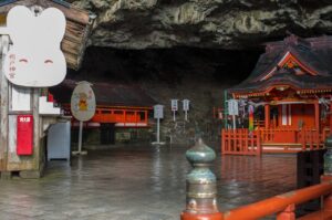As you descend, the rhythmic sound of waves grows louder — and then, the entrance of the cave comes into view. Inside, the shrine’s main hall glows softly under lantern light, blending perfectly with the natural rock formations. It’s one of the most mystical atmospheres in Japan.