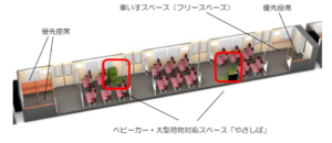ベビーカーやキャリーバッグ、スーツケースなどの大型荷物をお持ちの利用者が、周囲に気兼ねなく着席して過ごせるスペース「やさしば」を、車両中央の乗降扉付近に1両あたり2カ所設置します。