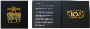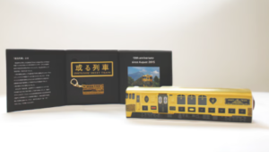 を収納できる専用ディスプレイケース。棚などに立てて飾ることができ、ケース表面には「或る列車」車両正面をモチーフにした金色箔押しデザインを施した特別仕様。