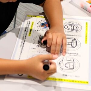 鉄道車両の「顔」をデザインしたオリジナル缶バッジを制作できる、子ども向けのワークショップです。