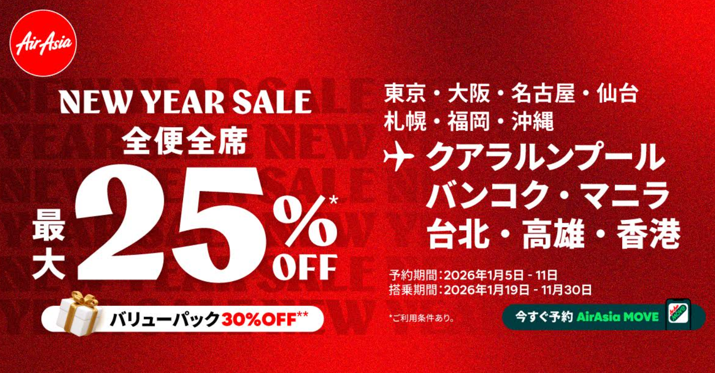 エアアジア「全便 全席25%オフセール」1月11日まで...